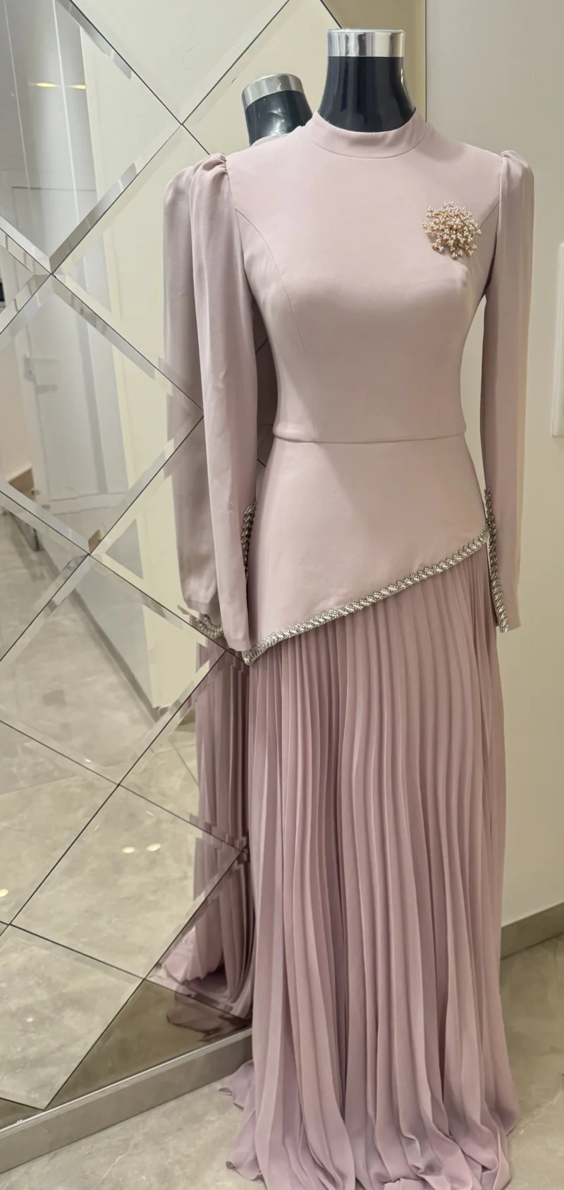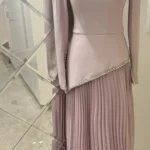 Robe soirée bimatière avec un haut structuré orné d’une bordure en strass et une jupe plissée.