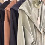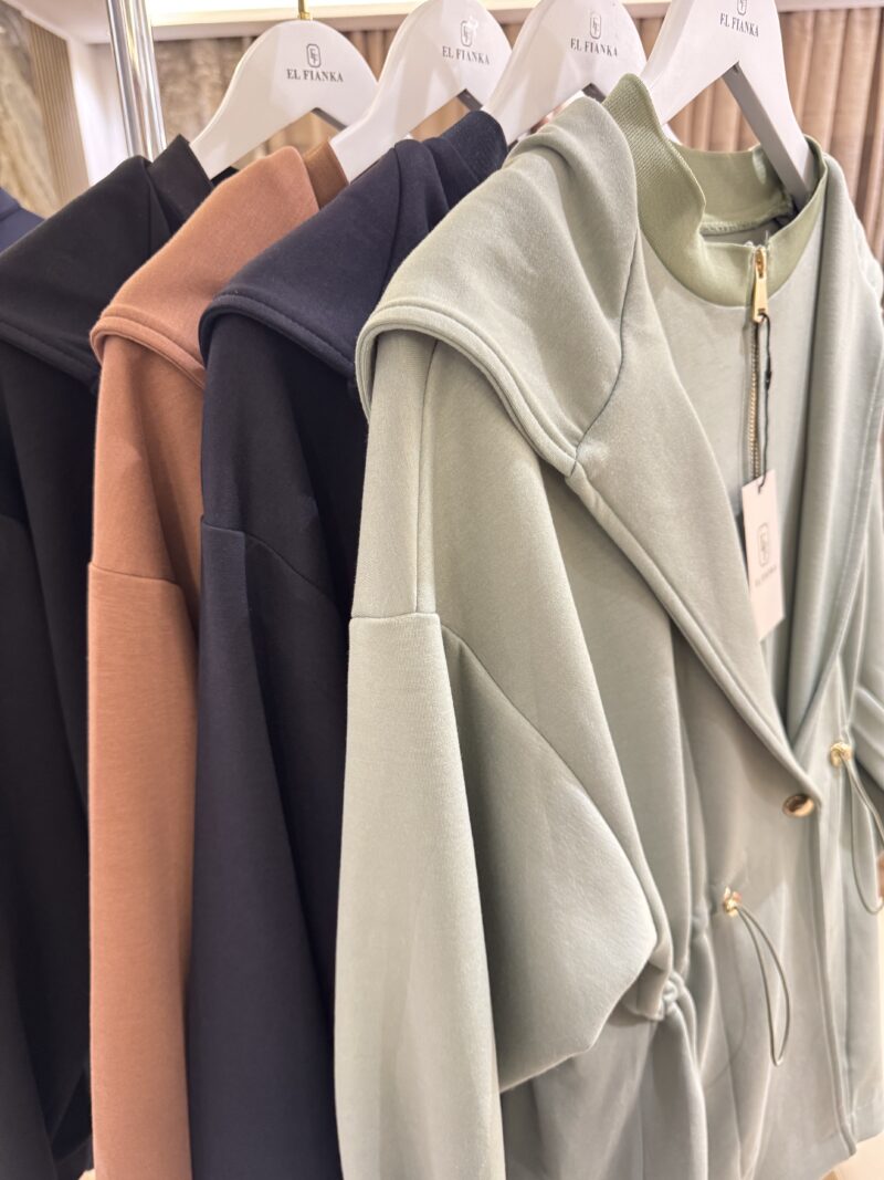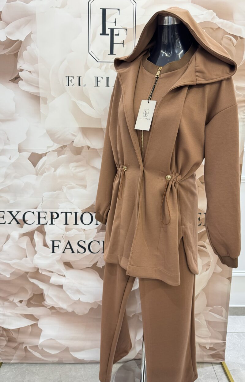 Un set sport composé d’une veste zippée à capuche avec taille ajustable et un pantalon fluide.